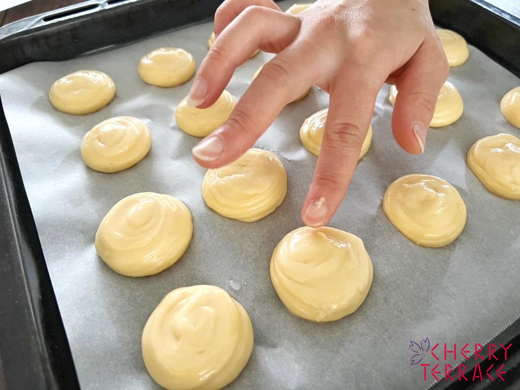 ④ 3を絞り袋に入れ、オーブンシートを敷いた天板に直径約4cmに丸く絞りだす。指先に少量の水をつけ、生地の先のとがったところを押さえ、形を整える。