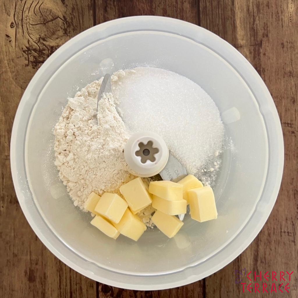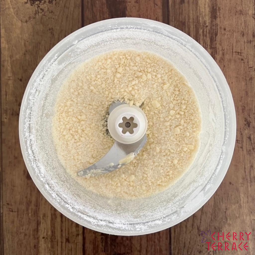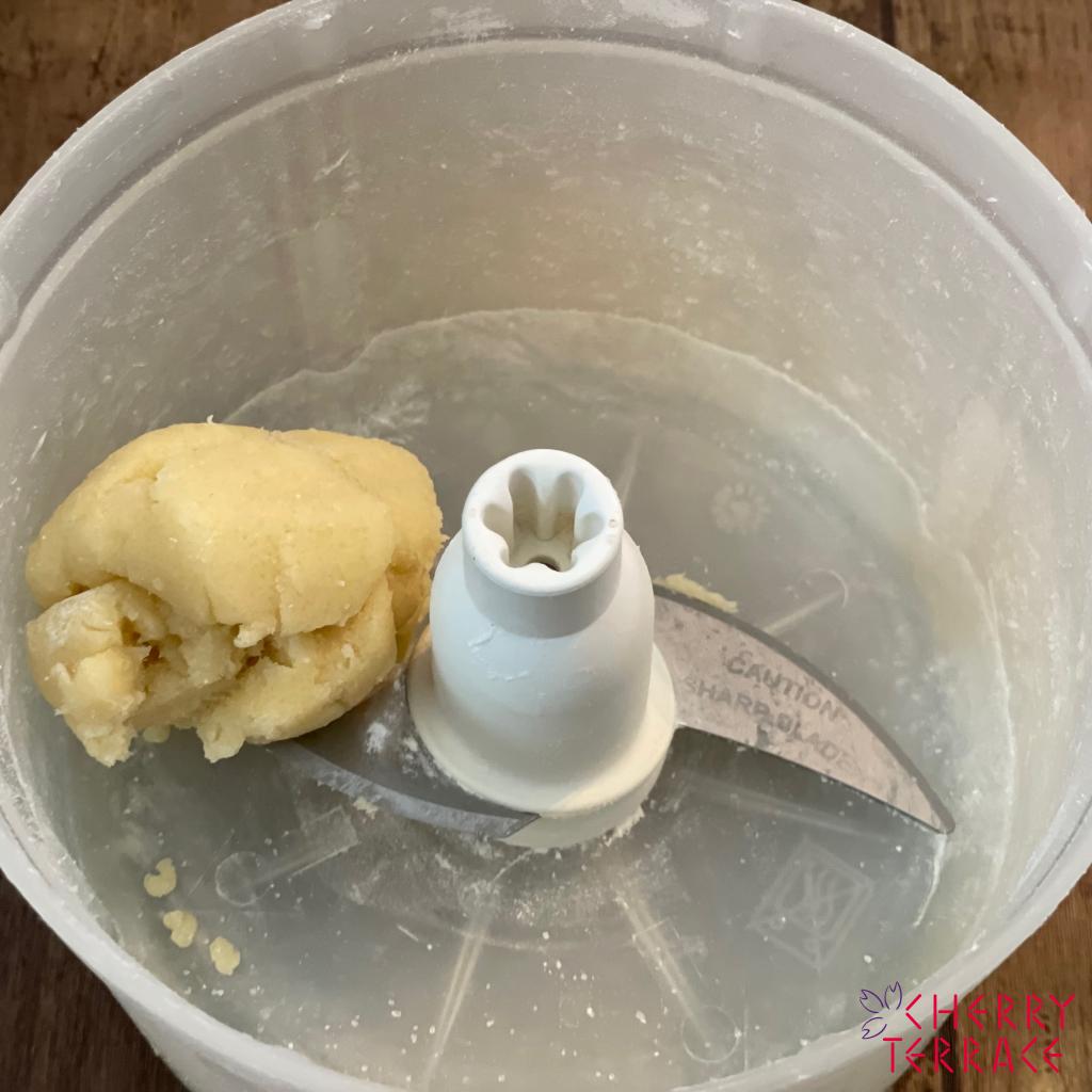 ① クッキー生地を作る。バーミックス(スライシー/チョッピングナイフ)にクッキー生地の材料を入れ、混ぜ合わせる。オーブンペーパーで生地をはさみ薄く伸ばす。冷凍庫で休ませる。