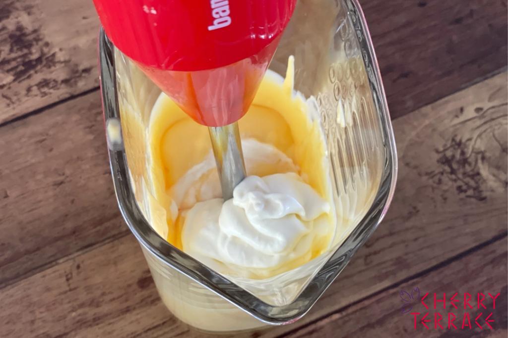 ⑦ 生クリームをバーミックス(ビーター)で7分立てに泡立てる。冷めたカスタードをガラスピッチャーに入れ、同じビーターでなめらかにする。生クリームを少しずつ合わせて、ディプロマットクリームを作り、シューに詰めて完成です。