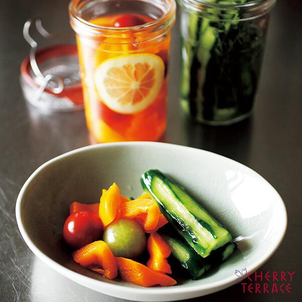 きゅうりはシンプルに、パプリカはレモンの酸味を効かせて漬ける浅漬けのような酸っぱすぎないピクルス。控えめの塩気なので1週間以内で食べきるようにする。ピクルス液はもう一度使えるが、野菜の水分が多少出て薄まるので、塩を少し足すといい。他にゴーヤー、ズッキーニ、にんじんなどで。食べる時に粗塩を少し振っても。オリーブオイルをかけてチーズを添えるのもおすすめ。