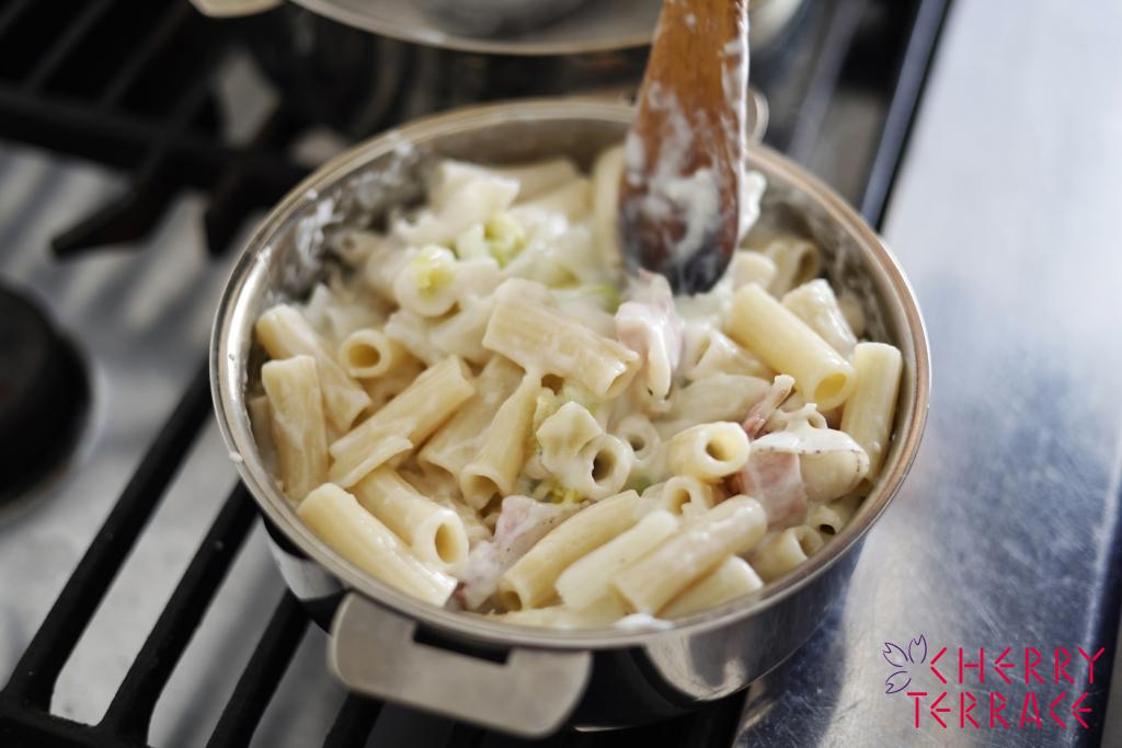 少し太めの、茹でるだけでもう美味しそうなマカロニがトルティリオーニ。皆が大好きなグラタンで魅力を発揮するパスタです。茹で方は前回の、お湯の量は少なめにして水気を余り残さないやり方が合います。後半で具材を加えて一緒に蒸し煮。ベシャメルソースは作って見ると手軽なもので、1週間くらいなら保存もできます。全体量を考えると、バターやチーズは少なめなので、ラウデミオの風味を加えながら作って行きます。ぜひ秋冬の定番に。フジッリ、カサレッチェ、ペンネで作っても。
