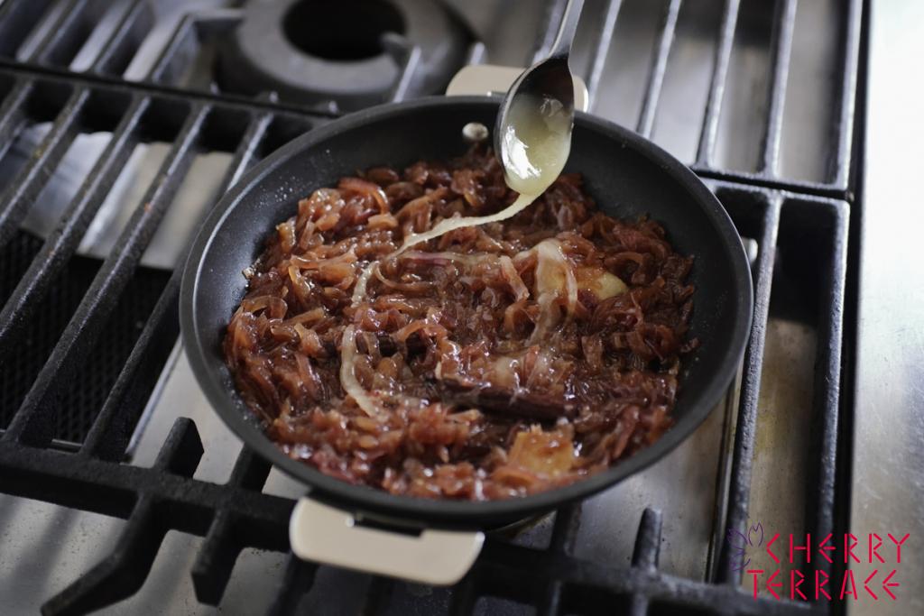 蜂蜜は2回に分けて加えるのがコツ。普通の玉ねぎでも。色の美しさを出すには赤玉ねぎが向いています。