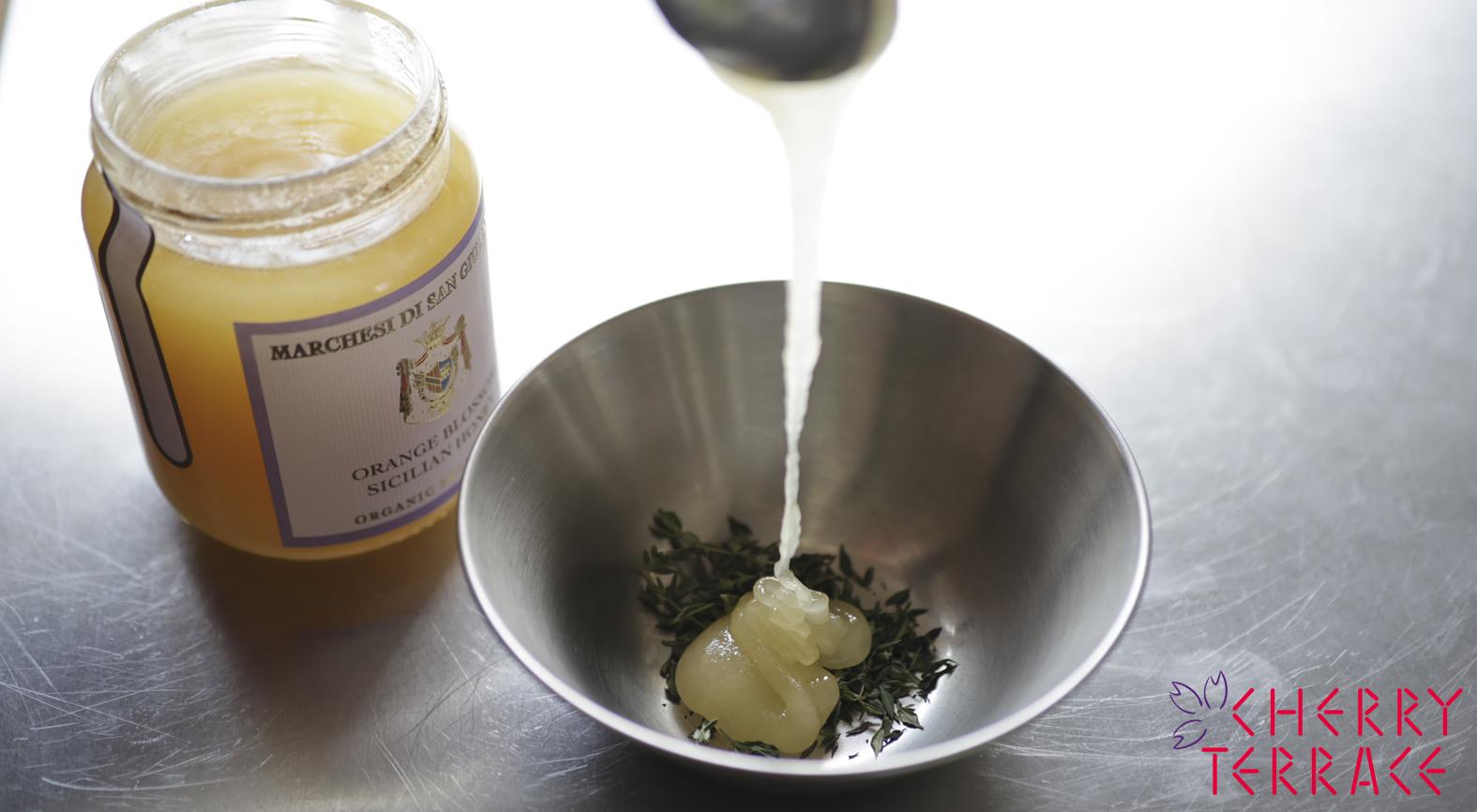 2回に分けて加え、はじめは土台作りの甘味料として、仕上げ前にオレンジ蜂蜜の個性を風味に加える。