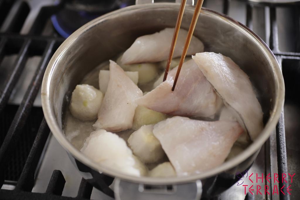鱈は崩れやすいので、できるだけ重ならないように、里芋に蓋をするように乗せること。
