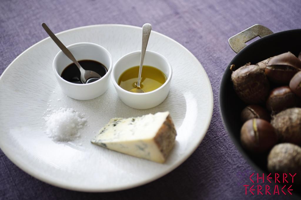 栗を加えて焼き上げ。それぞれが皮をむき、栗を添えて、ディヴィーノとラウデミオ、粗塩で味付けする、