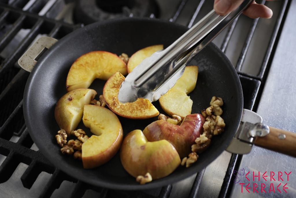 ほんの少しのラウデミオをソテーに使い、香りよく焼きます。素焼きのくるみは、実はオリーブオイルといい相性なので、ラウデミオでこんがりと焼き、ラッコルトで仕上げるという使い方です。りんごが熱いうちにかけて馴染ませます。