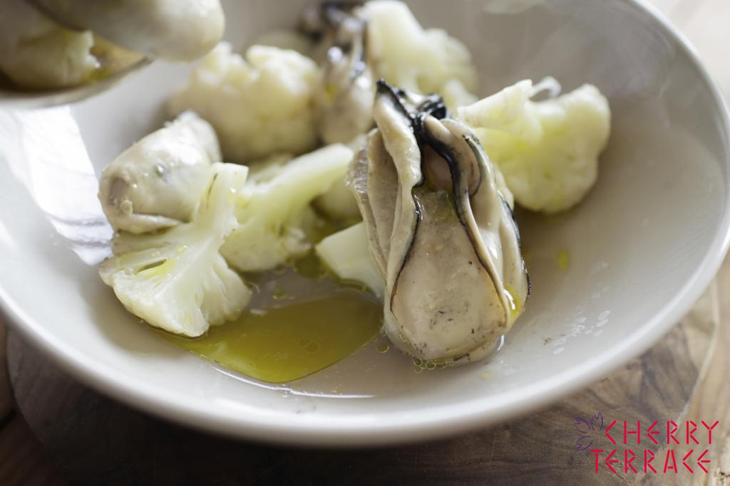 いつでも手軽に作れて調理時間も短く、熱々が楽しめる蒸し物です。カリフラワーはあらかじめ茹でておくと、牡蠣と一緒に温める程度でいいので、火を通す時間の心配もいりません。牡蠣はすぐに火が通るので、沸騰したお湯で2、3分。硬くならないようにします。せいろを使わず、鍋を簡易蒸し器にする場合は、蓋をすると縁が熱くなるので、キッチンペーパーのはみ出した部分が焦げないように火加減に注意します。中火をキープして、安定した蒸し加減で。