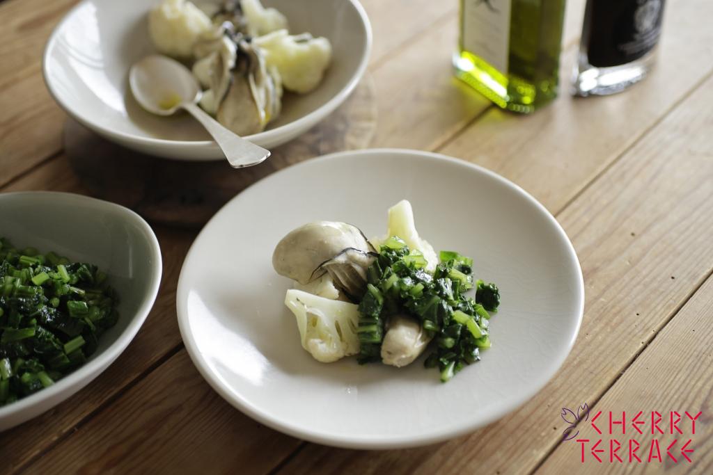 かぶの葉と茎をさっと茹で、水気を絞って端から細かく刻みます。塩、ラッコルト、バルサモディヴィーノをふりかけてマリネするようにしばらく置き、そのまま食べたり牡蠣とカリフラワーの蒸し物に添えたり、またはご飯にのせても美味しいものです。