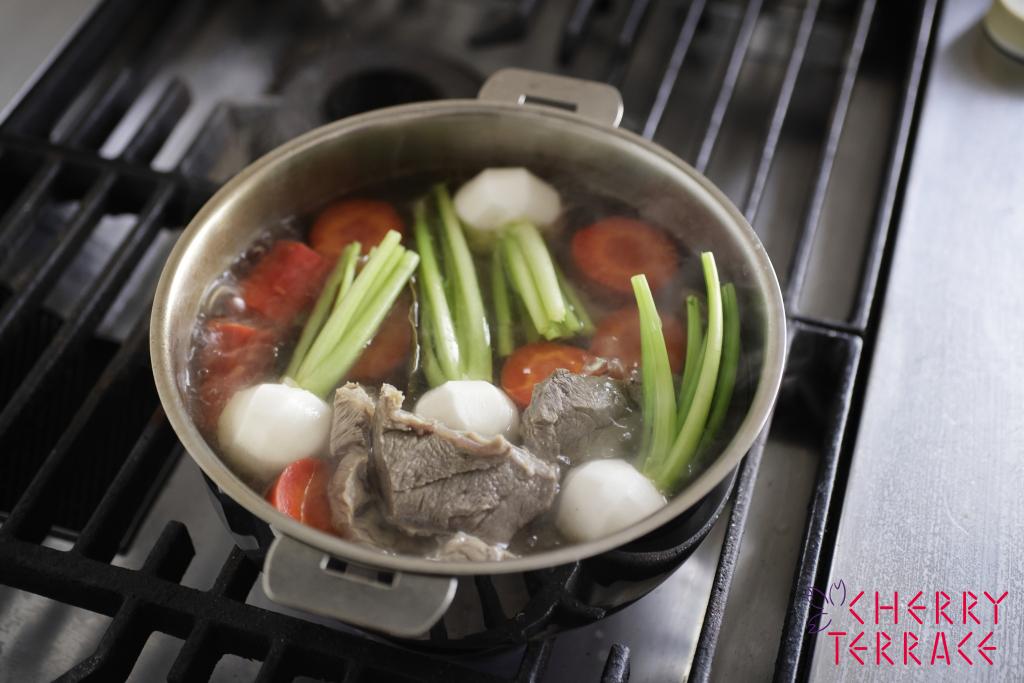 おでんといえば、大根に練り物、昆布、卵、関西なら牛すじなどが連想されますが、少し洋風に振ったおでん風のスープ煮にしてみました。出汁は牛すね肉。時間がかかりますが、何かやりながらなら、ある程度煮たところで途中火を止めて中断しても大丈夫です。