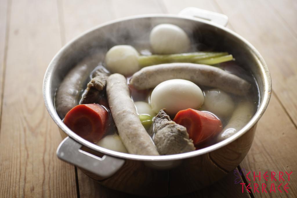 金時にんじんは色が濃く少し和風。かぶも茎をつけたのでいつもと違う感じ。卵はおでんにつきものなので入れるとして、出汁に奥行きを加えるのにソーセージを入れてみました。クリアなスープにラッコルトという、素材重視のおでんです。