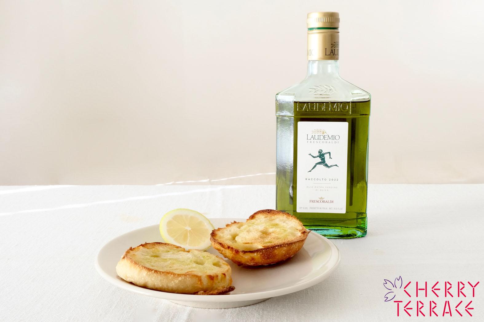 最近は美味しいパン屋さんが増えて、チャバッタやフォッカチャの生地にチーズが練りこんであるようなパンも、よく見かけると思います。今回使ったパンも、シンプルな生地の中でチーズが溶けたタイプ。それを半分に切り分けて、縁に焼き色がつくくらいにトーストします。仕上げは、ラッコルトと本の数滴のレモン果汁。