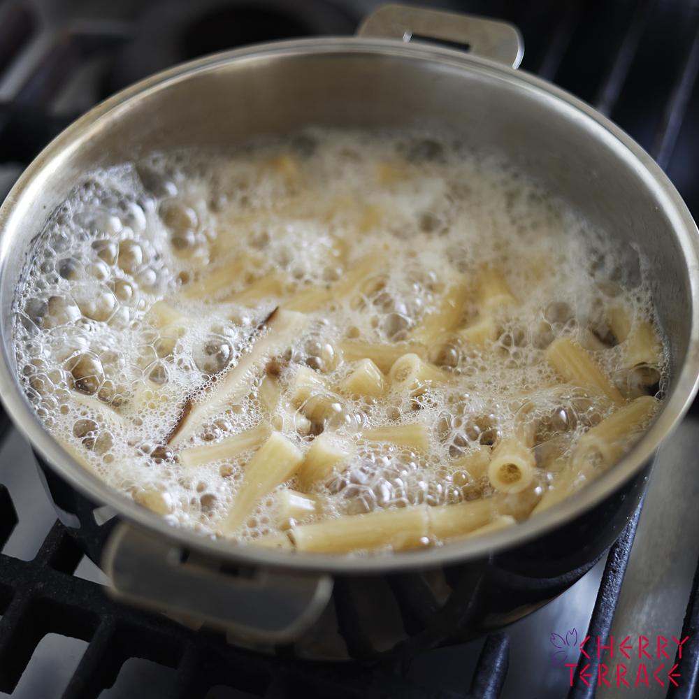 ちょっとした火加減で水分の蒸発の仕方は変わるので、オリーブオイルでくっつき合うのを防ぎ、スプーンで時々混ぜて茹で上げます。火が通る前に水分不足にならないように適宜水を足せばいいので、さほど神経質になる必要はありません。
