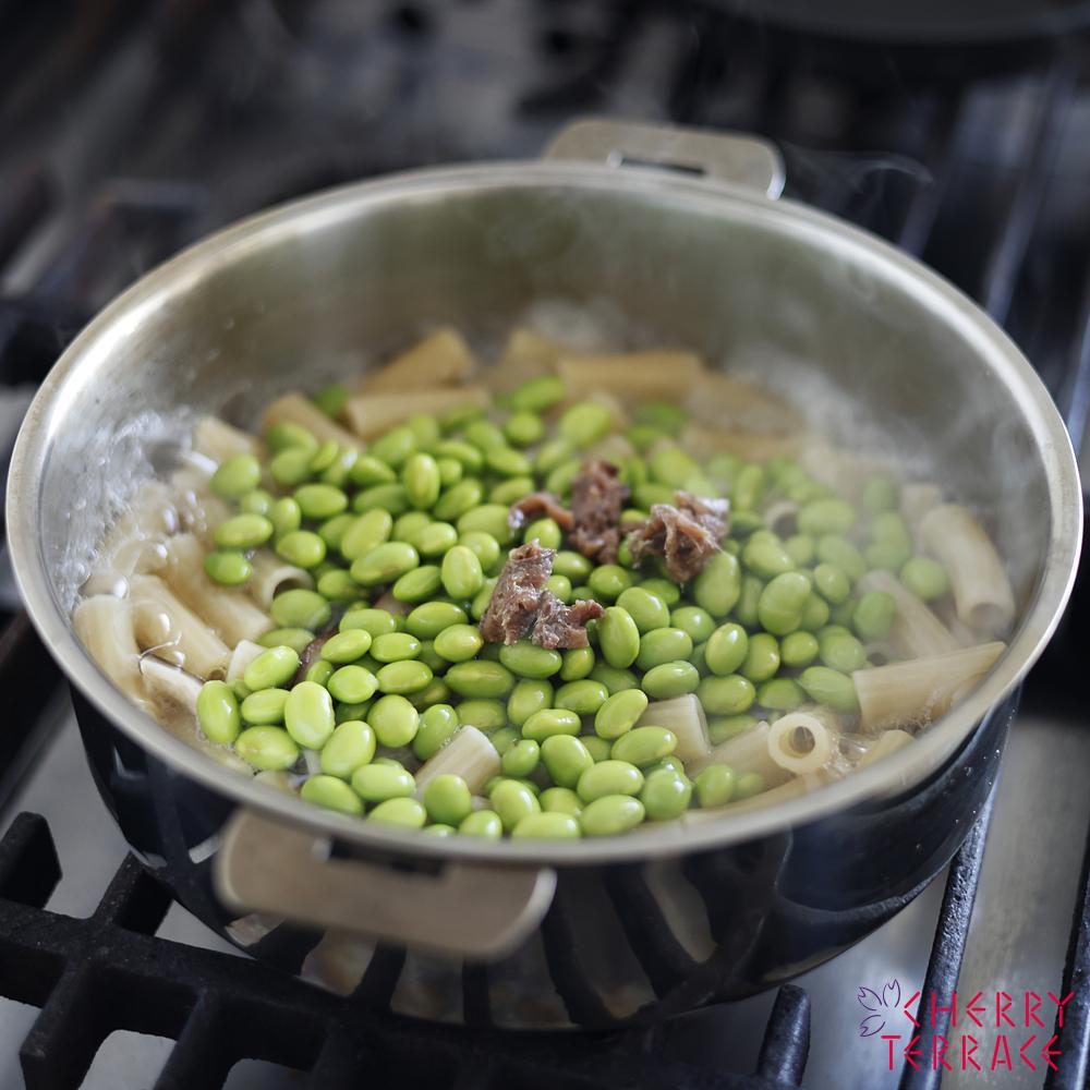 このとてもイタリア的なパスタを、昆布に干し椎茸を加えた出汁で茹でてみました。