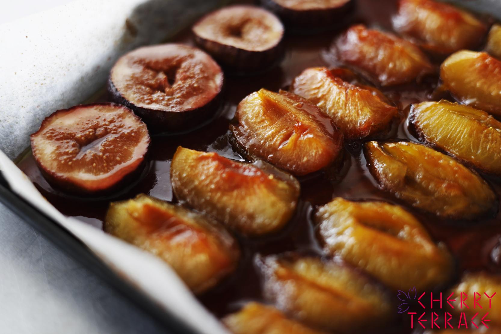 今回のコンポートは、いちじく、プルーン、プラムを3種類合わせてオーブンで焼きました。時間設定をしたらオーブン任せの楽さと、煮崩れるほどに柔らかいとはいえ、ジャムのようにはならず形を保って焼きあがるので、そっと保存してパンにとろりと乗せたり、チーズに添えたり、塊が残っているからこその美味しさです。コンポートにするメリットは、形を保つことともう一つ、美味しいソース状のシロップが一緒にできあがること。そこで、果物本体の水分に赤ワインを加えてみました。