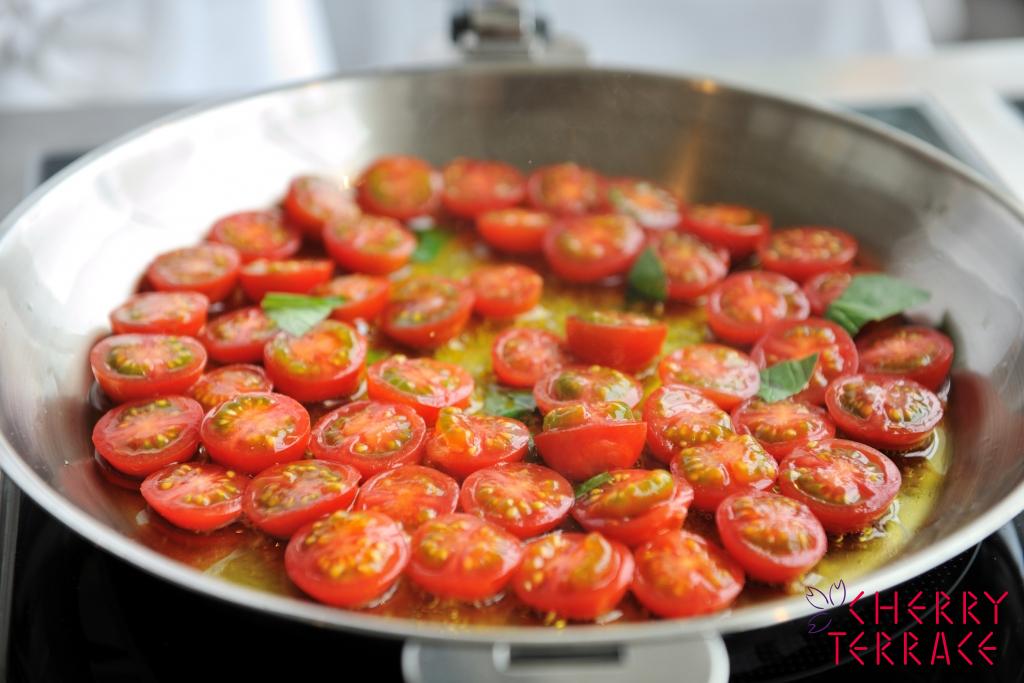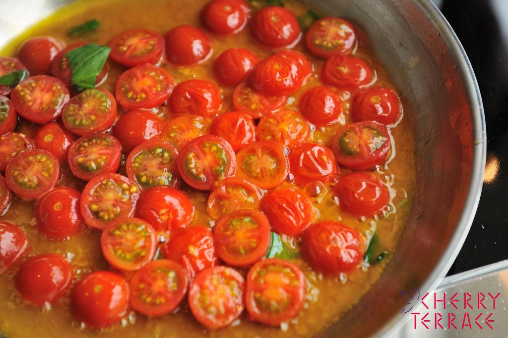 ★フレッシュトマトはチェリートマトよりも水分が多く煮詰める工程が必要で、煮詰めるとコクが出てくるので味をまとめてくれるにんにくを使用します。