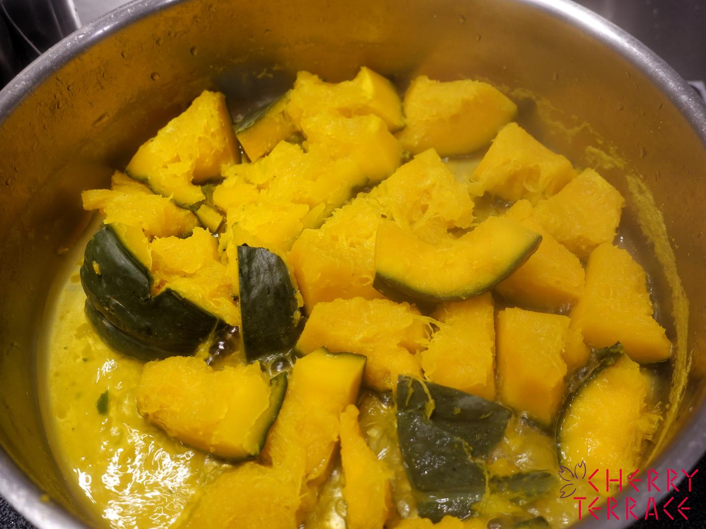 ★かぼちゃは粉ふきにし、わざとパサつかせるのがポイント。
