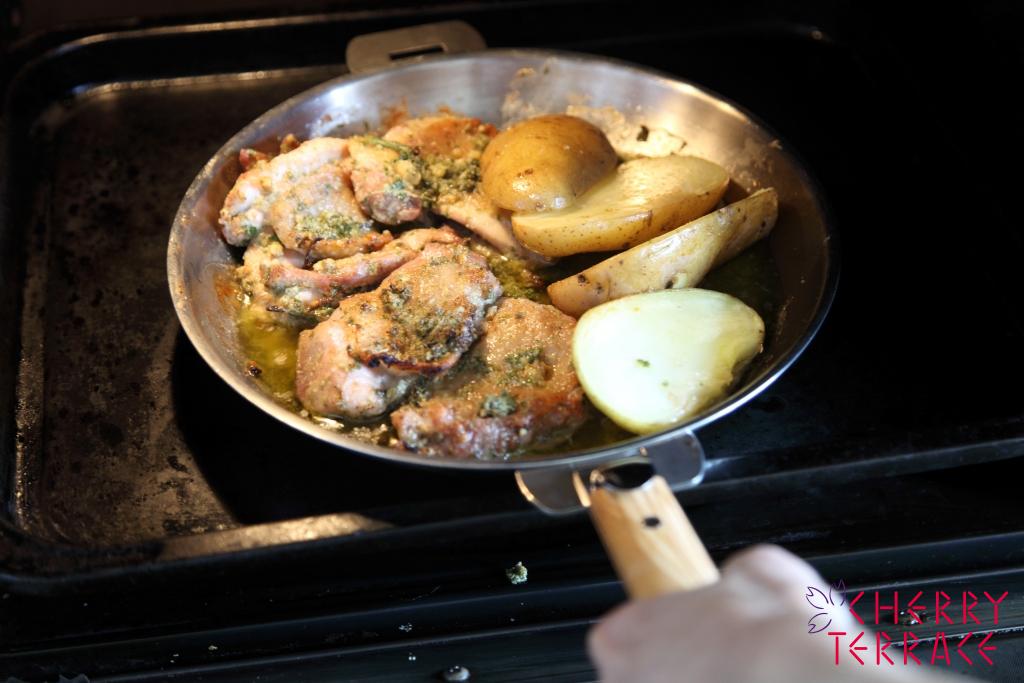 バーミックスで、パセリ、にんにく、くるみ、オイルなどをよくつぶし混ぜ、鶏肉にもみ込んでからオーブンで焼きます。香ばしいソースの香りと、鶏肉の旨味が染み込んだポテトのおいしさは絶品です。