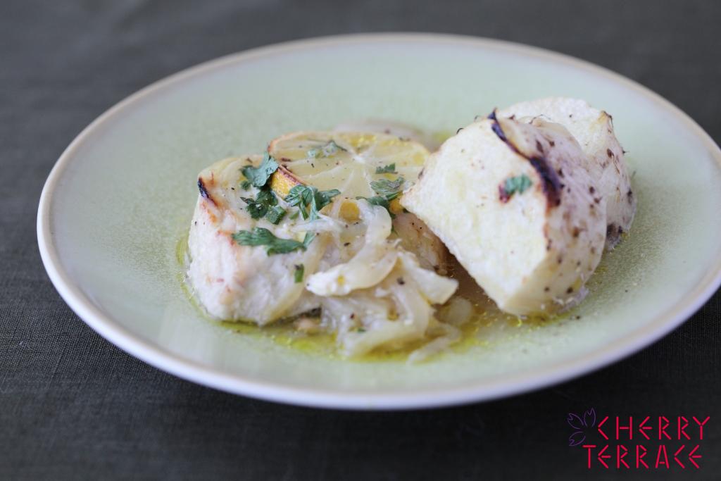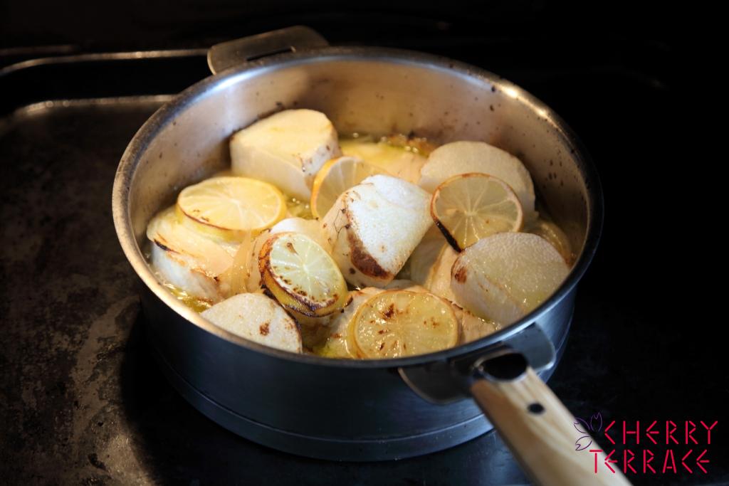 厚めに切った長芋のしゃきしゃきした食感と、ふんわり焼き上がったメカジキの食感のコントラストが楽しめます。オーブンで焼く途中、汁を回しかけることで全体にレモンの風味が染みわたり、香り豊かに焼き上がります。