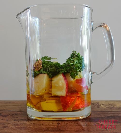りんごと玉ねぎ、セロリ、パセリなどの野菜がたっぷり入った自家製ヘルシードレッシング。店頭で実演をさせていただくときにいつも大人気だったレシピです。りんごと野菜のやさしい甘味は、子供から大人までおいしく楽しめます。