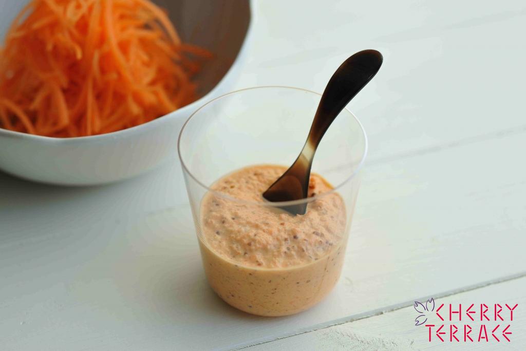 にんじんをバーミックス(ミンサー)ですりおろし、バーミックス(ウィスク)で作ったマヨネーズ、マスタード、レモン汁などと一緒に混ぜ合わせます。にんじんと一緒にいただくとまさしくにんじんの共和えです。まろやかなドレッシングは、蒸した根菜類にもおすすめです。