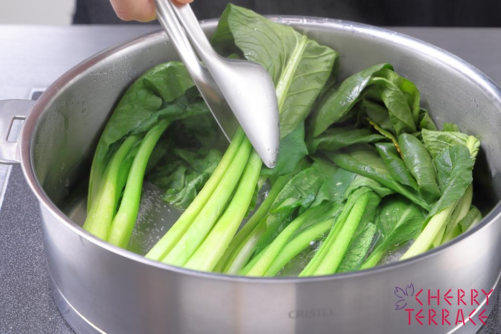 ① 小松菜1袋分(約200g)の株の大きさを揃える。 水で洗い、水気を切らずにクリステル浅鍋24cmにそのまま入れ、塩0.5gを加え中火で加熱する。