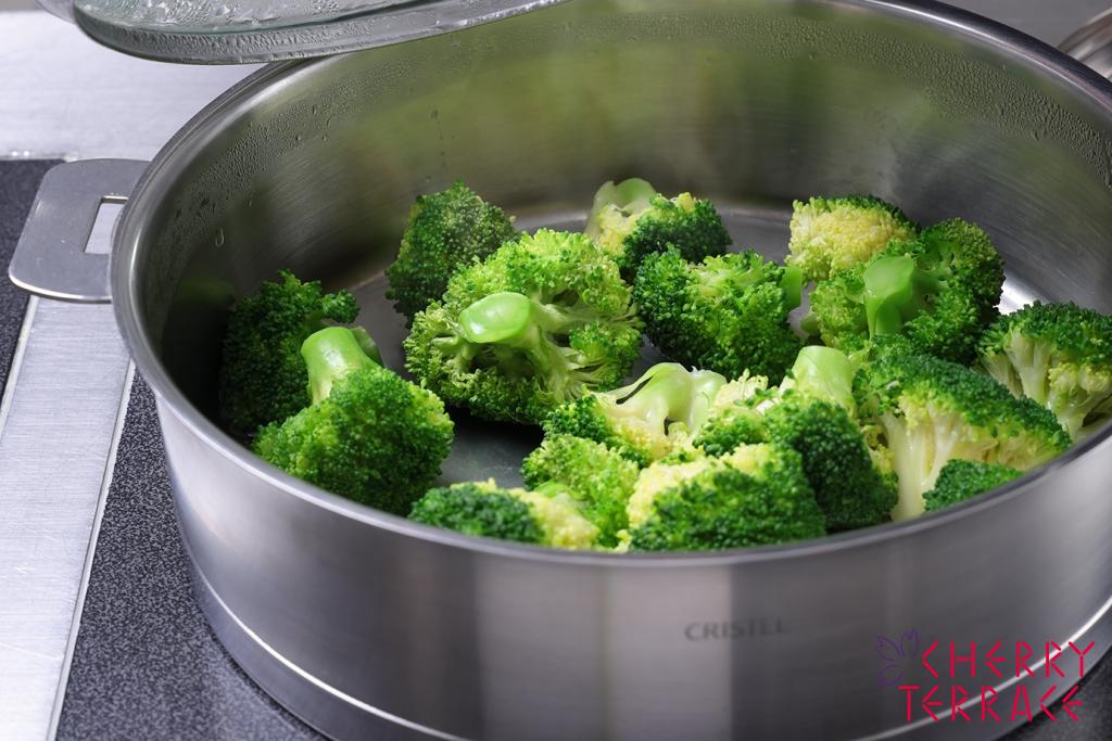 ② クリステル浅鍋24cmにブロッコリー、水50ml、塩0.5gを加え中火で加熱する。