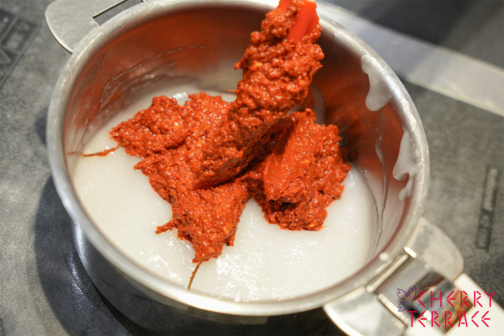 ④ バーミックス(ミンサー) にAの唐辛子以外の材料をいれ、ペースト状になるまでよく混ぜる。唐辛子は飛び散るので最後にヘラで混ぜる。