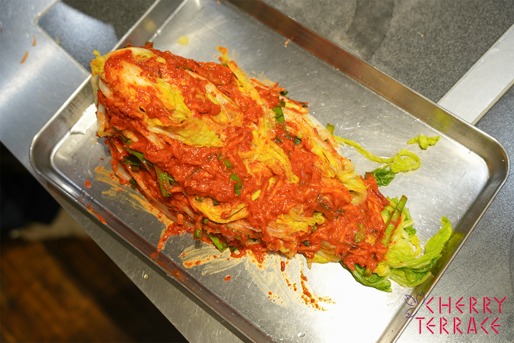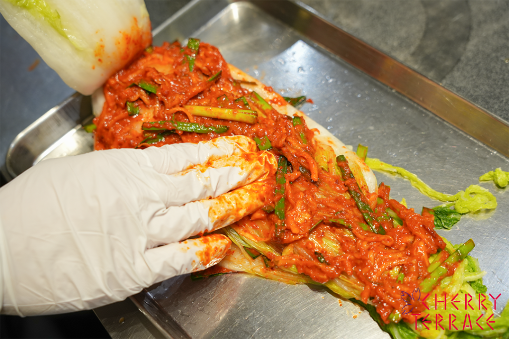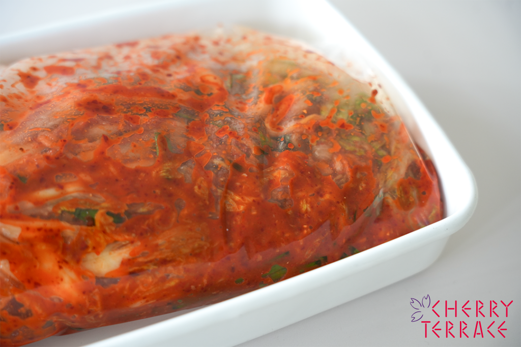 ⑥ ①の白菜の外葉から順に⑤のヤンニョムを塗る。丸めて保存袋に入れて1~2日常温で発酵させてから冷蔵庫に入れる。