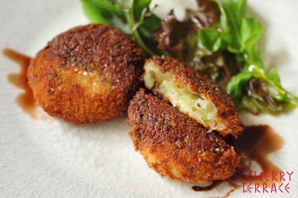 長ねぎとじゃがいもだけのシンプルなフリッタティーネ(小さなコロッケ)の仕上げにIGPをソースのようにかけて。酸味が揚げ物の味を引き締めます。「鶏のレバーのカツレツや、トンカツにかけるのもおすすめですよ」。