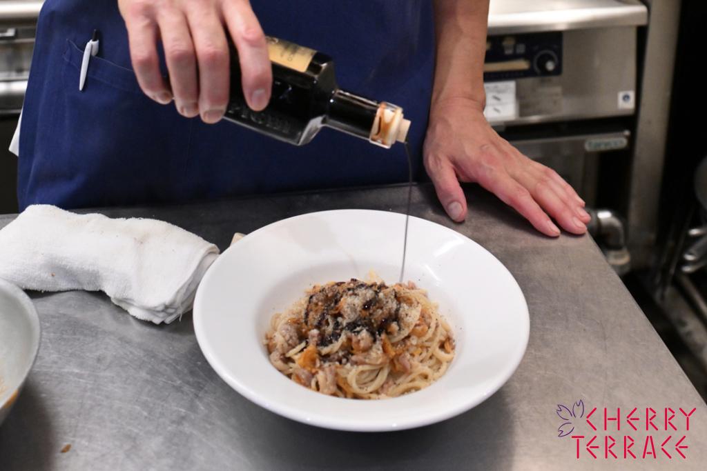 主に北イタリアで修行し、現地モデナの料理にも精通されている北村シェフに、それぞれの使いこなしを教えていただきました。「バルサミコ モデナIGPは酸味が際立っているので、その酸味を効かせた料理に。バルサモ・ディヴィーノはストレートな旨味を生かした料理に向いていると思います。」