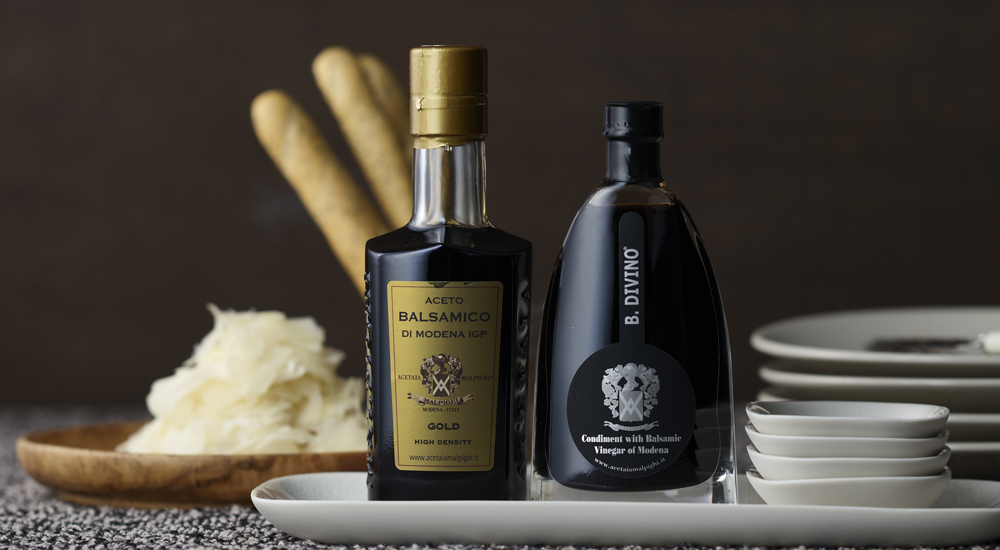 | モデナのバルサミコの品質と風味を保証するIGPとして認可されたバルサミコ | バルサミコのおいしさを伝えたいとマルピーギ社が独自に開発したバルサミコ | |