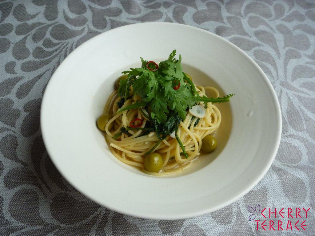【春菊とグリーンオリーブのペペロンチーニ】 春菊とグリーンオリーブは好相性... -