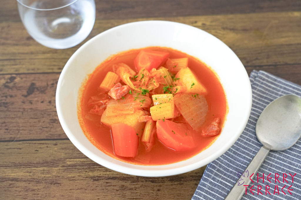 野菜ゴロゴロ和風ミネストローネ【野菜ゴロゴロ和風ミネストローネ】 野菜がたっぷり入った和風のミネストロー...