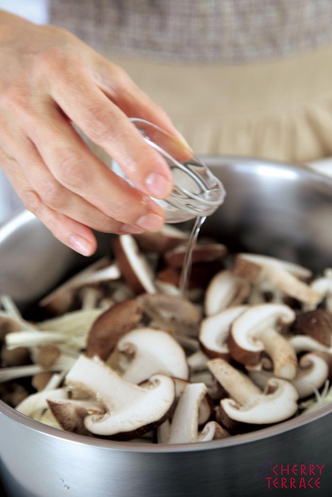 【酒蒸しきのこミックス】 クリステル深鍋にきのこと調味料だけを入れて加熱し... -