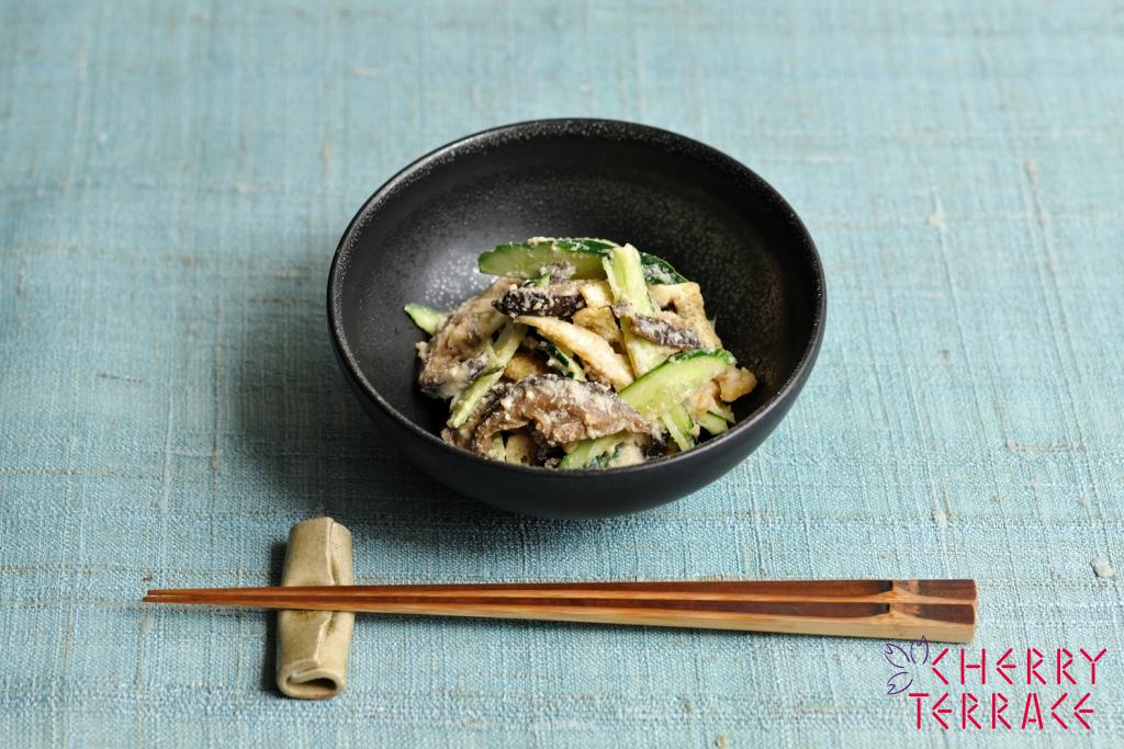 【きゅうりとしいたけの甘酢和え】 すりたてのごまがたっぷり入った甘酢衣で和... -