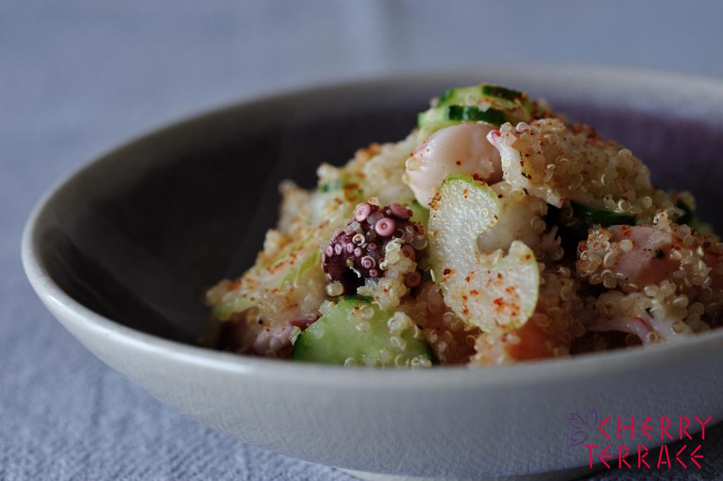 【魚介と野菜、キヌアのサラダ】 バルサモ・ビアンコとレモンの風味で食べるシ... -