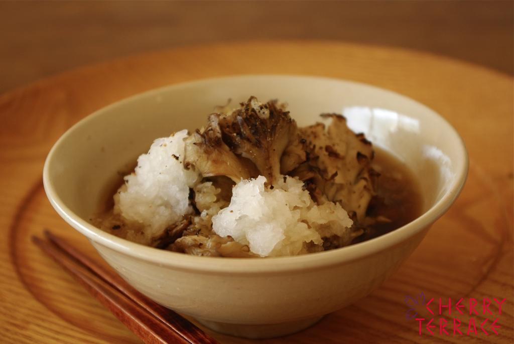 【焼きまいたけの雪見仕立】 日に干して、きのこを少し乾燥させると味が濃くな... -