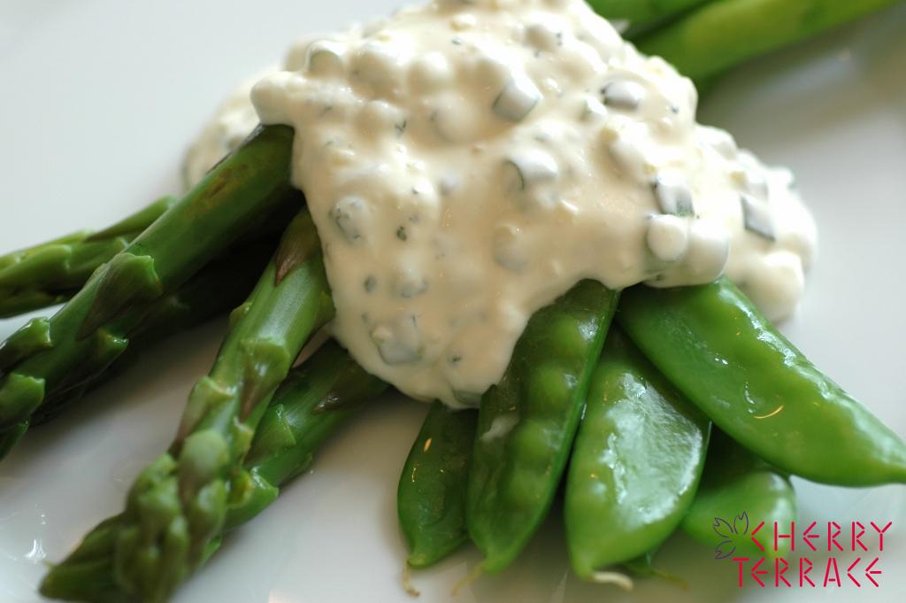 【アスパラと絹さやのサラダ サワークリームソース】 ゆでたブロッコリーやじ... -