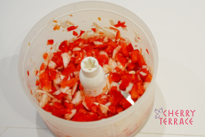 - バーミックス(スライシー/チョッピングナイフ)に玉ねぎ、パプリカ、にんにくを入れ粗めのみじん切りにする。