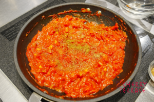- トマトペーストを加え、軽く炒め香りを出す。続けてトマト缶を加え煮詰め、スパイスを加える。
