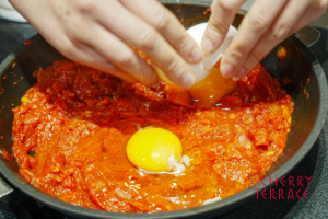 - トマトソースにくぼみを作り、卵を落とし加熱する。白身が白く固まってきたら、完成。お好みでパセリをかけ、ピタパン等につけていただく。