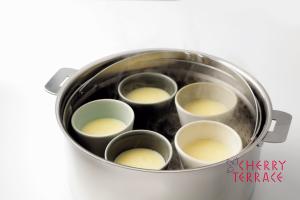 • バスケットに3を並べ、4のプレートの上に置き、ふたをして中火で2〜3分蒸し、卵液の表面が白くなったら、弱火で約10〜15分蒸す(竹串を刺して透明な汁が上がってくればOK)。火を止め、バスケットごと取り出す。