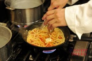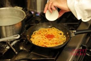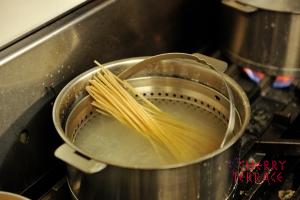 - クリステル深鍋にクッキングバスケットをセットし、塩分が濃いめの湯(2.5%)でスパゲッティを約14分茹でる。別の鍋に湯を沸かしておく。