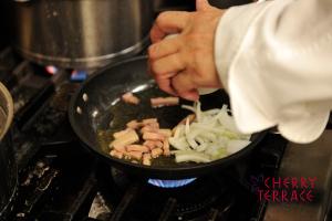 - クリステルフライパンにラウデミオとベーコンを入れて中火で加熱し、焼き色をつけてカリカリにする。2に玉ねぎを入れ塩をし、炒めて水分を飛ばす。