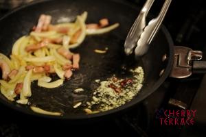 - フライパンを斜めにしてオイルだけを集めてにんにくを加える。にんにくが色づき始めたら赤唐辛子を入れる。