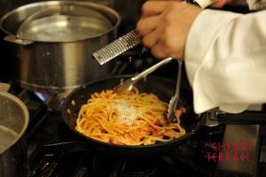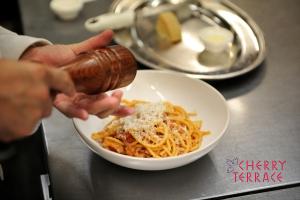 - 仕上げにペコリーノトスカーナと黒こしょうを上からかける。