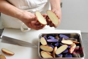 - じゃがいもは皮付きまるごとゆでて、冷めたら冷蔵庫に入れ、できれば一晩寝かせる。