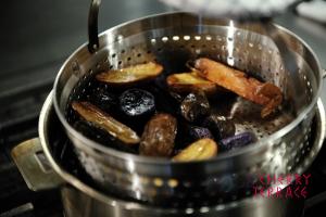 - クリステル深鍋にクッキングバスケットをセットし、植物油とラードを入れ180℃になったらじゃがいもを入れる。