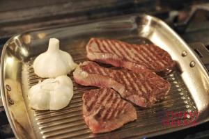 - クリステルグリルパンをよく熱して、さっとラウデミオを塗る。にんにくの断面を下にして焼く。牛肉は、片面をまずかっちりと焼く。時々返して両面にこんがりと色がつき、指でおさえた時の弾力がフニャッとしていれば中はレア。弾力が強くなればなるほど火が通っている。好みの焼き加減に仕上げる。※にんにくは先に焼いておき、ある程度火が通って仕上がりに近いくらいのところで肉を焼き始める。