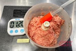 - 1の冷めた玉ねぎと残りの材料を全てバーミックス(スライシー/チョッピングナイフ)に入れ1分20秒混ぜる(途中で、へりについた具材をスパチュラなどで寄せる)。